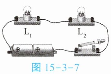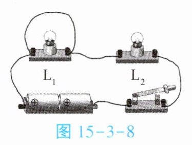 4. 小军连接了如图 15-3-7 所示电路,闭合开关一段时间后,小灯泡 $ L_1 $、$ L_2 $均熄灭,小军用一根导线检查电路故障。图 15-3-8 为小军将导线直接接在 $ L_1 $的两端时的情景,此时发现 $ L_2 $发光。