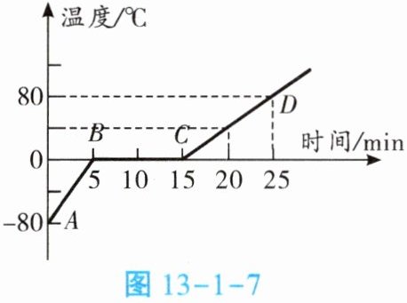 3. 如图13-1-7所示是小红同学做冰熔化实验时绘制的温度—时间图像,冰的质量是 $100g$,若相同时间内物质吸收的热量相同,请你根据图像,回答下列问题:$[c_{冰} = 2.1×10^{3}J/(kg·^{\circ}C), c_{水} = 4.2×10^{3}J/(kg·^{\circ}C)]$