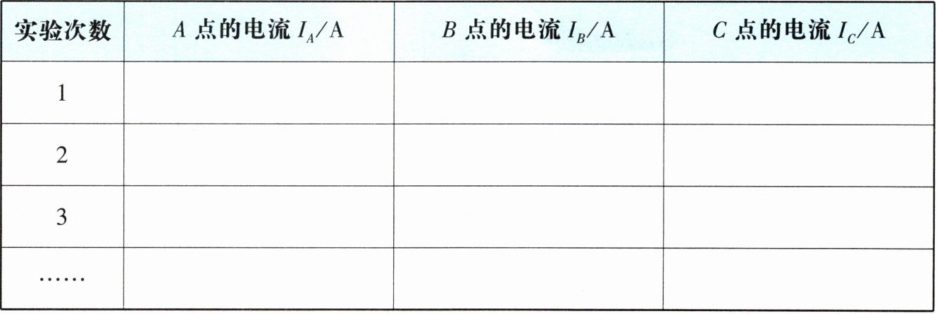 |实验次数|A 点的电流 $ I_A/A $|B 点的电流 $ I_B/A $|C 点的电流 $ I_C/A $|