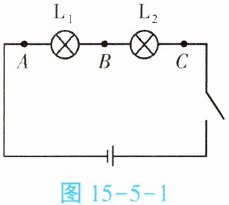 1. 知识重温:上节“电流的测量”中的活动三告诉我们,只有一条闭合回路时,这条闭合回路上的电流处处相等。如果在活动三中增加一个小灯泡组成串联电路(如图 15 - 5 - 1),再将电流表分别接在电路中的 A、B、C 三个位置,测出的电流会是什么关系呢?