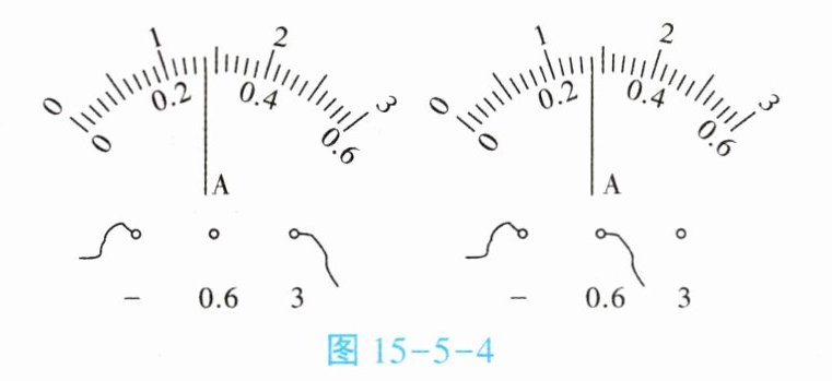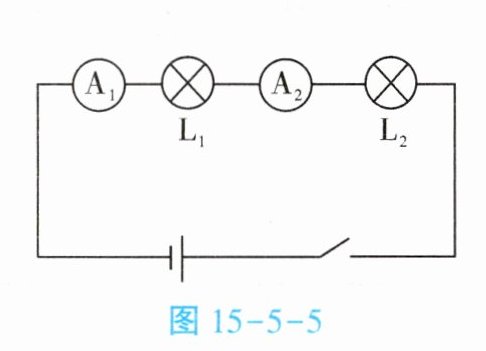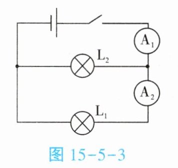 1. 如图 15 - 5 - 3 所示,当开关闭合后,两灯均发光,电流表 $ A_1 $、$ A_2 $ 的指针位置如图 15 - 5 - 4 所示。