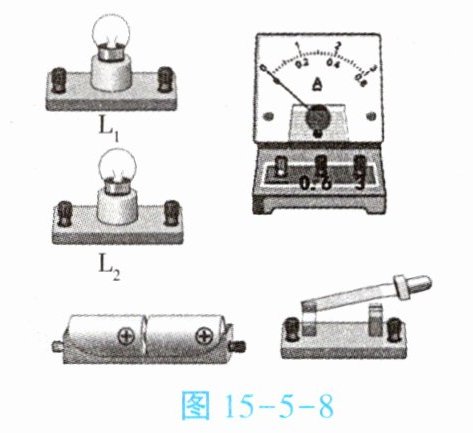 3. (1) 在下面的虚线框中画出灯泡 $ L_1 $ 和灯泡 $ L_2 $ 并联、电流表测通过灯泡 $ L_1 $ 的电流的电路图,并完成图 15 - 5 - 8 的实物连接。