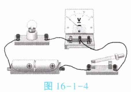 V。5. 动手实验:按图 16 - 1 - 4 连接实验电路,在所有元器件均完好的情况下,闭合开关,电压表的指针是否偏转?小灯泡是否发光?