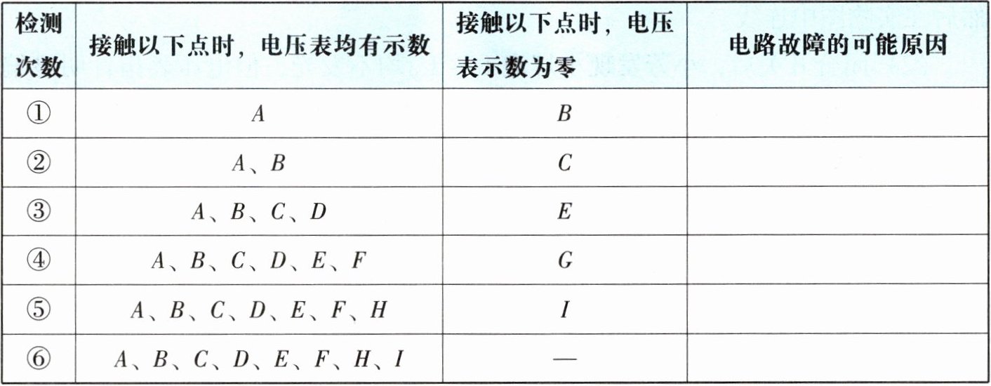 |检测次数|接触以下点时,电压表均有示数|接触以下点时,电压表示数为零|电路故障的可能原因|