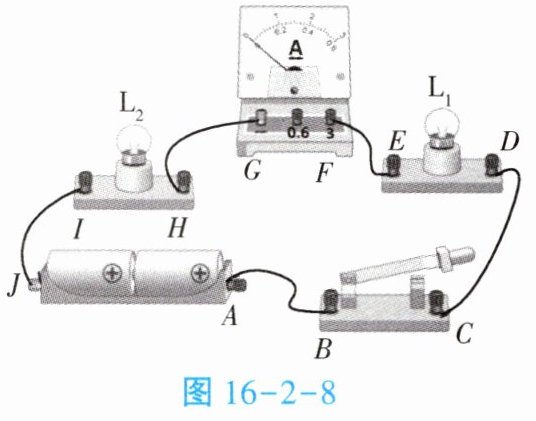 (1) 如图 16-2-8 所示电路,开关闭合后,小灯泡 $ L_1 $、$ L_2 $ 均不发光,电流表的示数为零。某同学利用一只电压表检测电路故障,闭合开关后,把电压表的负接线柱连接到电源负极 $ J $,然后用连接电压表正接线柱的导线依次接触电源正极 $ A、B、C、D、E、F、G、H、I $ 各接线柱。