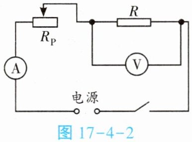 2. 如图 17-4-2 所示,电源两端电压恒为 $6\ V$,闭合开关,此时电路中电流表的示数为 $0.2\ A$。调节滑动变阻器 $R_{P}$,使得电压表的示数为 $2\ V$,定值电阻 $R$ 的阻值为( )