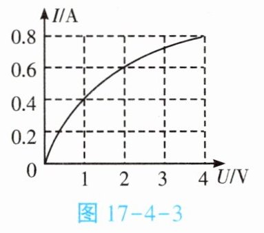 (1)由图17-4-3可知,当通过小灯泡的电流为0.6A时,小灯泡两端的电压为2V,小灯泡的电阻$R = \frac{U}{I} = \frac{2V}{0.6A} \approx 3.3\Omega$。