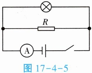(3) 若此小灯泡与一阻值为 $10\ \Omega$ 的定值电阻 $R$ 并联接入电源两端,如图 17-4-5 所示,当小灯泡两端的电压为 $4\ V$ 时,电流表的示数为多少?