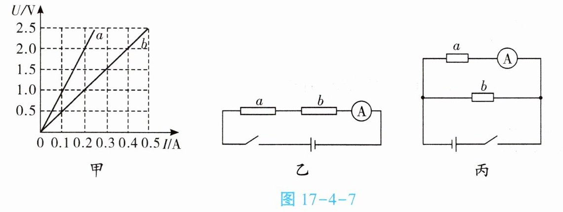 通过两电阻 $a$、$b$ 的电流与其两端电压的关系图线如图 17-4-7 甲所示,求:
