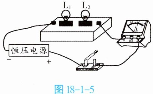 1. 如图 18-1-5 所示,两灯泡$ L_1、$$L_2 $在盒内的连接方式未知,电源电压为 6 V。开关闭合后两灯泡均发光,电流表读数为 0.9 A;若把$ L_1 $取下$,L_2 $仍发光,电流表读数变为 0.3 A。