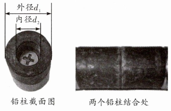 3. 课后,小明同学提出疑问:两个铅柱结合在一起,能否仅靠大气压强的作用就提起一桶桶装水?图13-2-8为铅柱截面图和两个铅柱结合处。假设两个铅柱能够完全接触,受力面积就是铅柱的横截面积$S_0,约为8×10^{-4}m^2。$(大气压强$p_0= 1.0×10^5Pa,$g取10N/kg)请通过计算判断两个铅柱结合后仅靠大气压力能否提起一桶质量为19kg的桶装水。