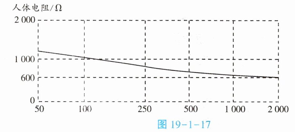 通过分析图 19-1-17 可知人体电阻随人体接触的电压 $ U = 220 \, V $ 的交流电频率的增大而