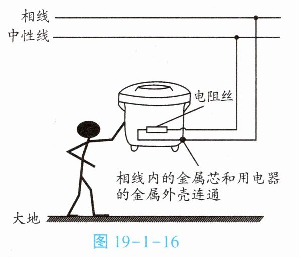 1. 如图 19-1-16 所示,万一用电器的金属外壳与相线间的绝缘层损坏,相线内的金属芯和用电器的金属外壳就会直接接触,人赤脚站在地面,手摸到了用电器的外壳。请判断是否有电流通过人体。如果有,请画出电流流经人体的路径(不需要画方向)并判断人体是否会发生触电事故;如果没有,请说明理由。