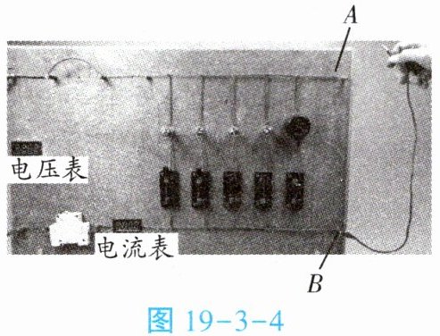 ①如图 19 - 3 - 4 所示,将额定电流为 1 A 的空气开关接入电路,两盏灯泡同时工作,记录电流表的示数为