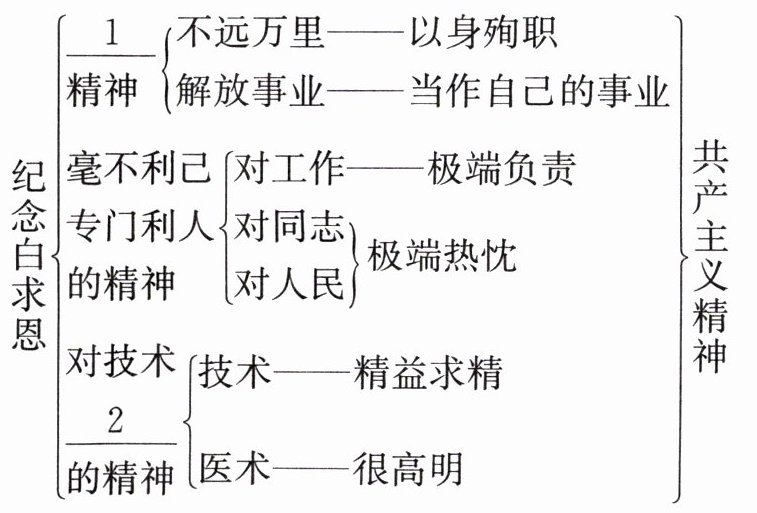 纪念白求恩$\begin{cases} \begin{cases} \underline{1} \\ 精神 \begin{cases} 不远万里——以身殉职 \\ 解放事业——当作自己的事业 \end{cases} \end{cases} \\ 毫不利己 \begin{cases} 对工作——极端负责 \\ 专门利人 \begin{cases} 对同志 \\ 对人民 \end{cases} 极端热忱 \end{cases} \\ 对技术 \begin{cases} 技术——精益求精 \\ \underline{2} \\ 的精神 \begin{cases} 医术——很高明 \end{cases} \end{cases} \end{cases}$共产主义精神
