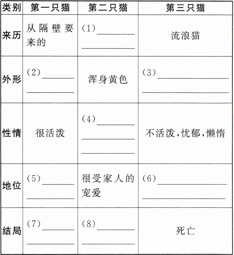 活动1:作者笔下的三只猫,特点不同,命运各异。默读课文,概括提取信息,利用下面的表格梳理课文内容。