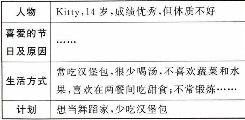 My best friend is Kitty. She is from America. She is 14 years old. She is good at lessons, but she is not very strong. Her favourite Chinese festival is the Mid-Autumn Festival because she likes the mooncakes best. On that day, she enjoys admiring the moon with her parents. She often eats hamburgers, but she seldom has soup. She doesn’t like vegetables or fruit. She likes eating dessert between two meals. She doesn’t often exercise. She dreams of becoming a dancer, so she decides to eat fewer hamburgers.