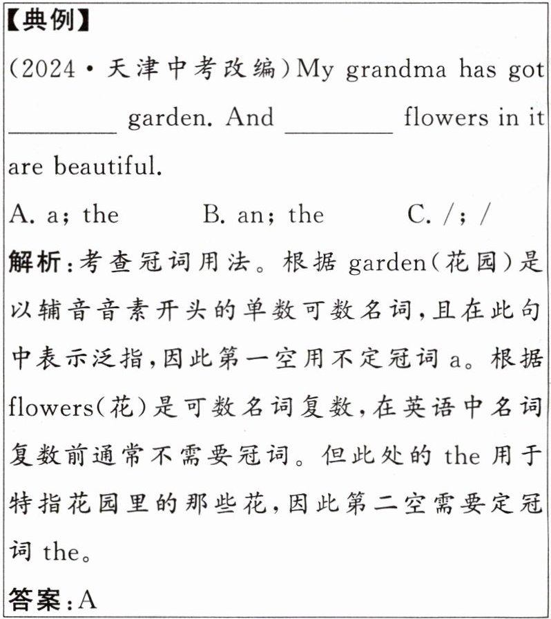 解析:考查冠词用法。根据garden(花园)是以辅音音素开头的单数可数名词,且在此句中表示泛指,因此第一空用不定冠词a。根据flowers(花)是可数名词复数,在英语中名词复数前通常不需要冠词。但此处的the用于特指花园里的那些花,因此第二空需要定冠词the。 答案:A