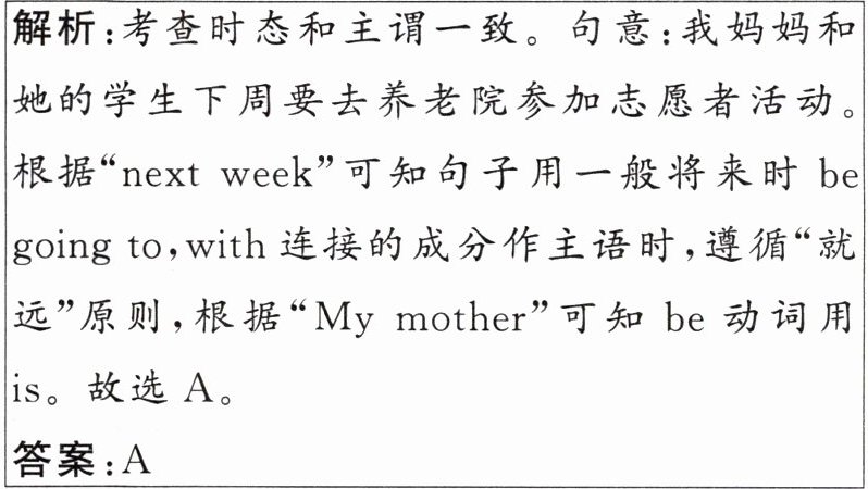 解析:考查时态和主谓一致。句意:我妈妈和她的学生下周要去养老院参加志愿者活动。根据“next week”可知句子用一般将来时be going to,with连接的成分作主语时,遵循“就远”原则,根据“My mother”可知be动词用is。故选A。