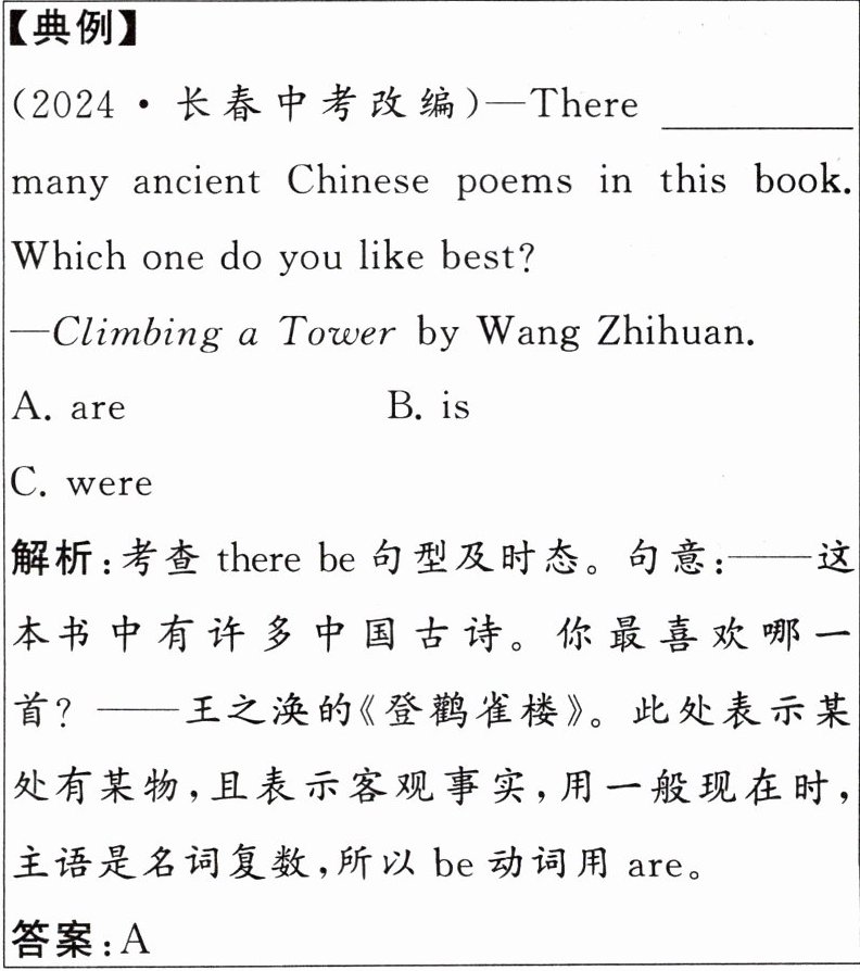 解析:考查there be句型及时态。句意:——这本书中有许多中国古诗。你最喜欢哪一首?——王之涣的《登鹳雀楼》。此处表示某处有某物,且表示客观事实,用一般现在时,主语是名词复数,所以be动词用are。 答案:A
