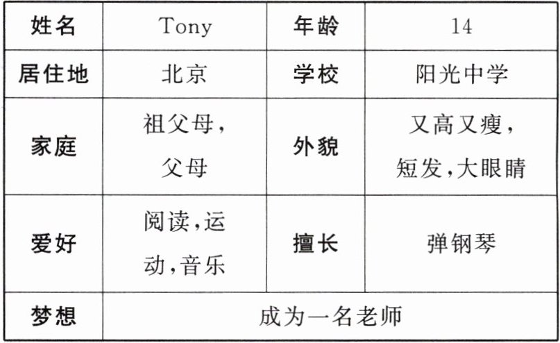 One possible version: Hello, I'm Tony. I am 14 years old. I live in Beijing with my grandparents and my parents. I study in Class 4, Grade 7 at Sunshine Middle School. I have short black hair. I am tall and slim. My eyes are big. I like reading and listening to music. I like sports, too. I am good at playing the piano. I want to be a teacher when I grow up. Let's make good friends!