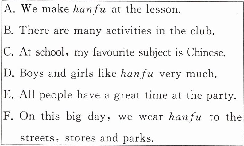 I can learn about Chinese history,geography and culture(文化). After school,I can also learn a lot in the hanfu club. 2. B