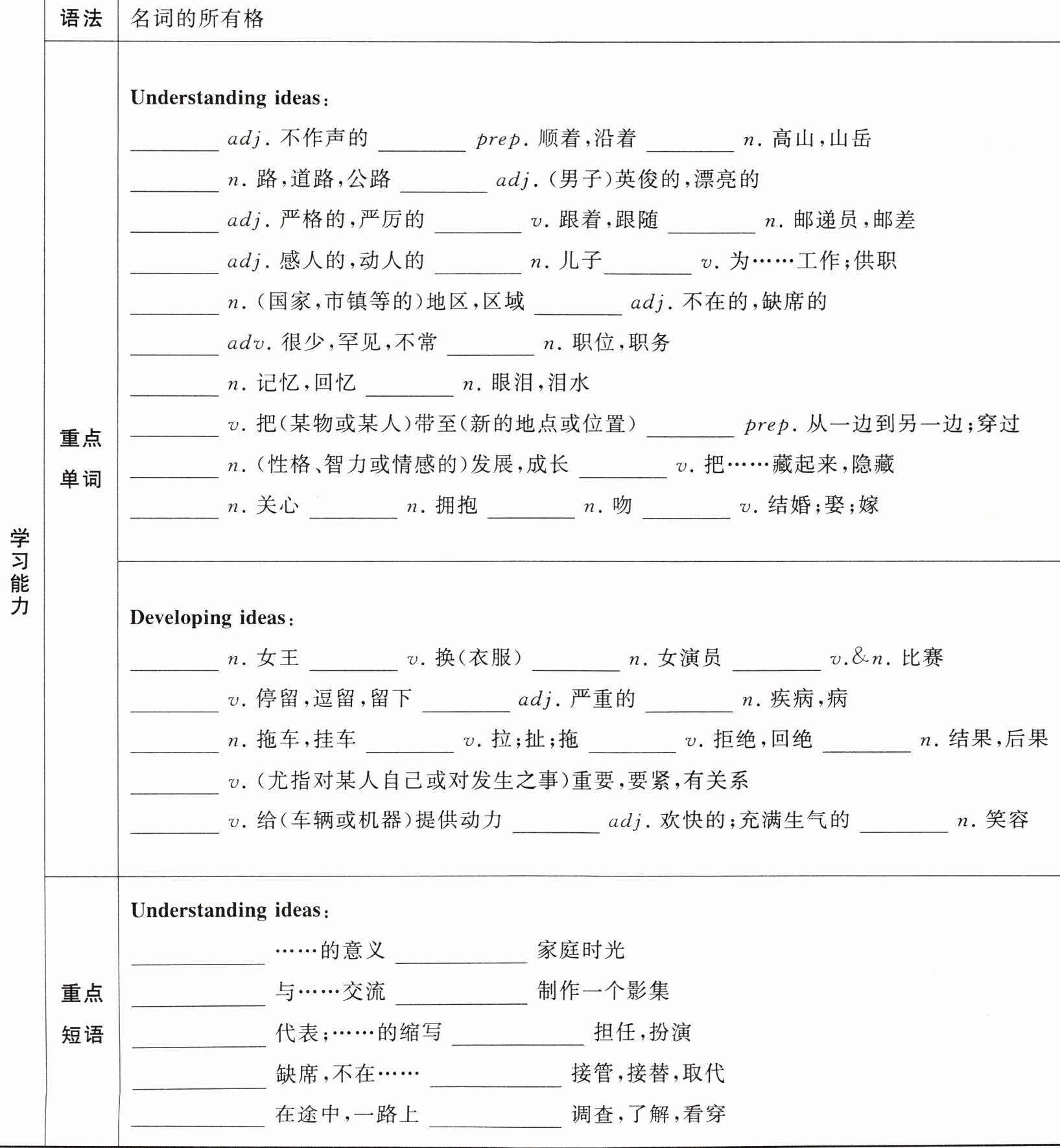 Understanding ideas: 1. with a strict face 2. touching story; between; and 3. start to 4. run down 5. is happy about Developing ideas: 1. Who; turn to 2. Can; change 3. has to; feels 4. more important than