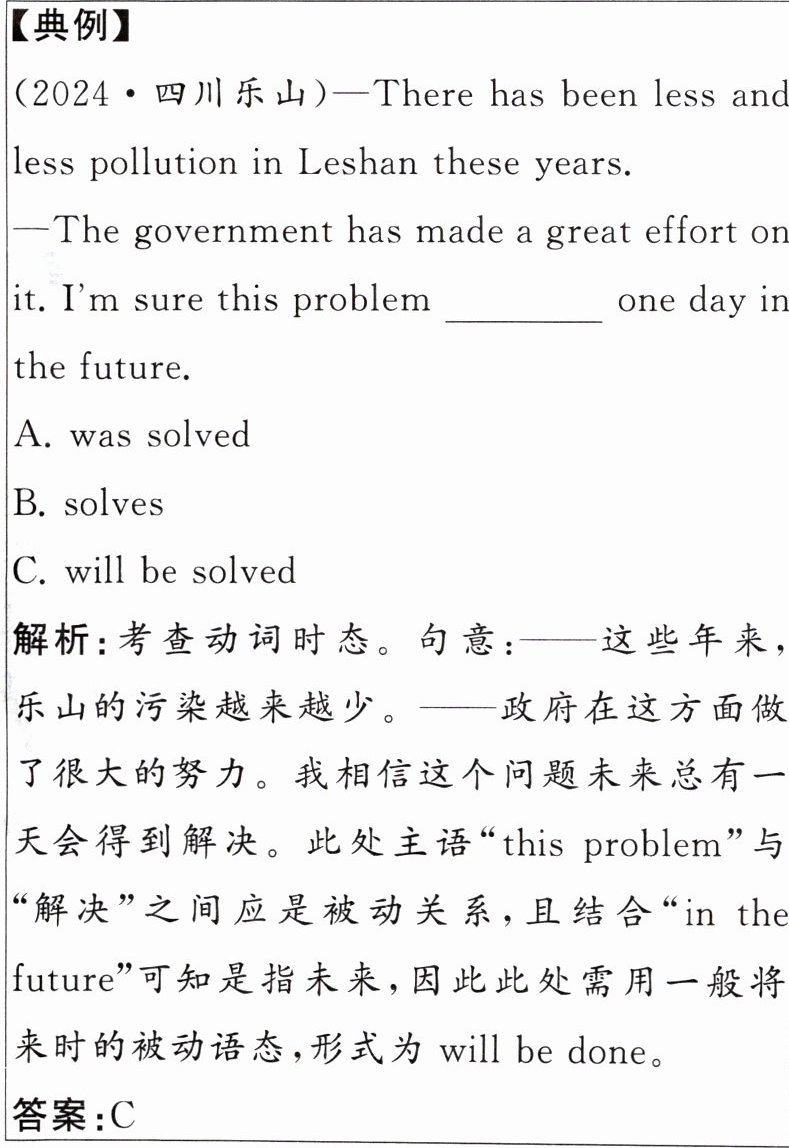 解析:考查动词时态。句意:——这些年来,乐山的污染越来越少。——政府在这方面做了很大的努力。我相信这个问题未来总有一天会得到解决。此处主语“this problem”与“解决”之间应是被动关系,且结合“in the future”可知是指未来,因此此处需用一般将来时的被动语态,形式为will be done。