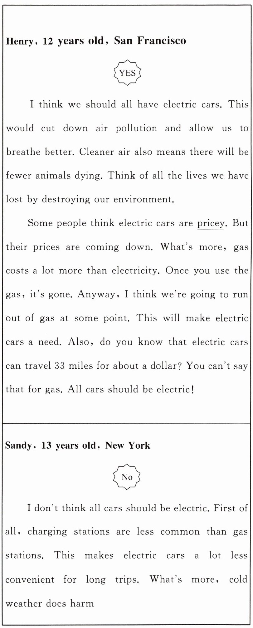 (2023·台州改编)The race is on to get more electric cars on the toad. People predict that electric cars might be more common in the future. But according to a 2021 survey by Pew Research Center, more than half of U. S. adults like gas-powered cars better. They say electric cars are expensive and charging(充电) them is a big problem. For now, most people plan to stick with gas-powered cars. We ask young readers what they think about electric cars.