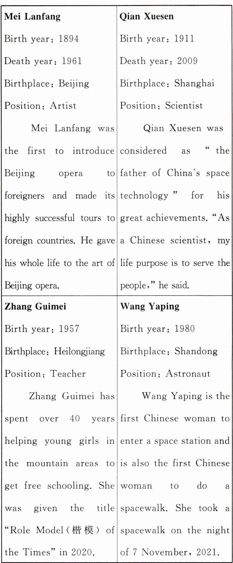 (2024·新疆改编)Here are four Chinese people with great achievements.