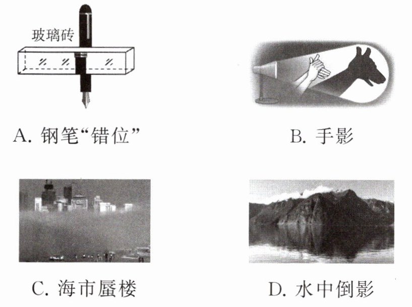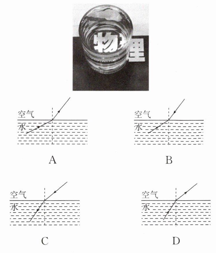 2. (2025·海南琼海期末)把玻璃杯放在书上,往杯内注水近满,如图所示,由上向下观察,比较你看到的杯外和杯内的文字。下列四幅图能正确解释此现象的是(