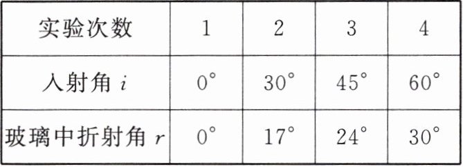 (选填“大于”“小于”或“等于”)入射角。(3) 当光以相同的入射角斜射入不同的介质中时,折射角一般