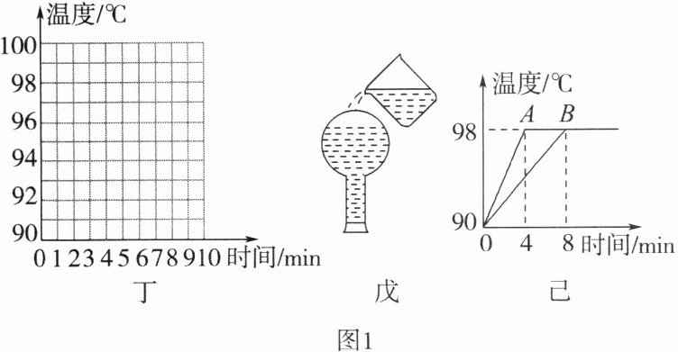②根据表格中的数据,在图丁中画出水沸腾前后温度随时间变化的图像(此问需根据数据描点连线,因无法实际绘制,略过具体操作)。