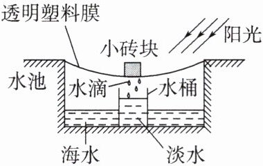 ,形成小水滴。(3)塑料膜下表面结成的水滴受重力的作用滑到最低处后滴入水桶中,得到淡水。此装置内水的总量