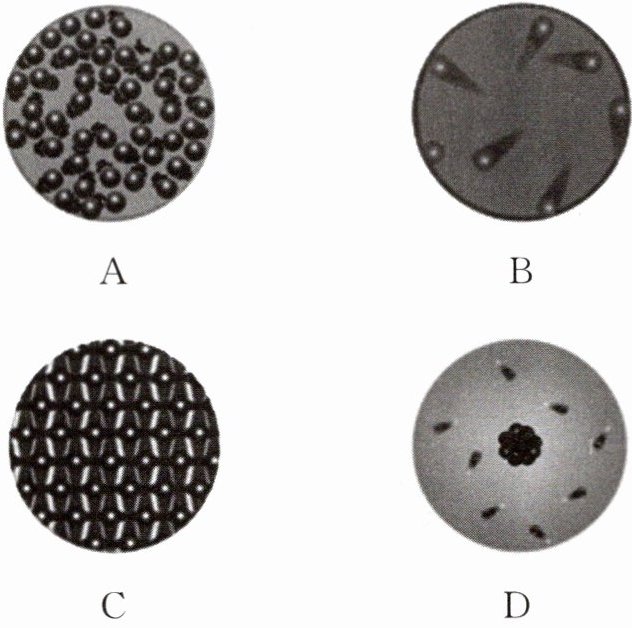 B 解析:固态物质的分子排列紧密,固体有一定的形状和体积;液态物质的分子没有固定的位置,运动比较自由,液体没有固定的形状,具有流动性;气态物质的分子分布散乱,间距很大,气体具有很强的流动性。从而可判断出图A为液态水的分子分布示意图,图B为水蒸气的分子分布示意图,图C为冰的分子分布示意图,图D为原子的内部结构示意图,故选B。