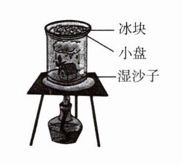 如图所示,在制造云和雨的活动中,小明对以下几个位置进行观察,该活动中:小盘底部的水滴是水蒸气遇冷液化形成的;水蒸气遇冷液化的过程中会放出热量,于是小盘上面的冰会受热熔化,于是冰少了,水出现了;烧杯后的“白气”是水蒸气液化形成的小水珠,水蒸气是无色透明的,不可能被看到;湿沙逐渐变干,是水从液态变为气态导致的,属于汽化。