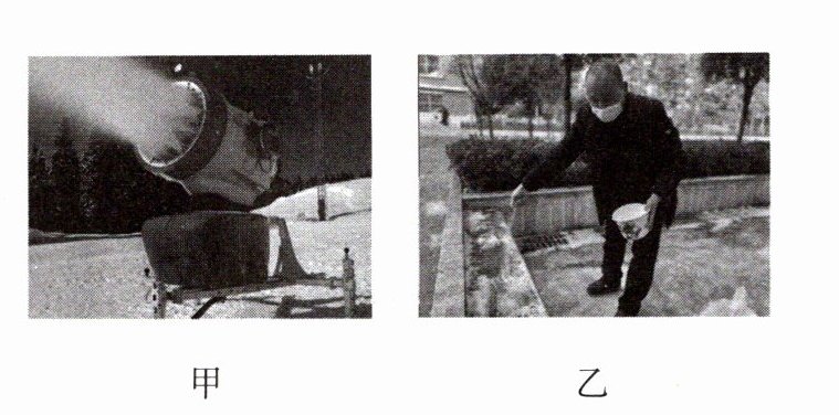 活动 2:某雪场内造雪机、雪枪同时“喷云吐雾”,鼓起漫天飞雪,如图甲所示,造雪机将水注入专用喷嘴或喷枪接触高压空气,将水分割成微小的小水滴并喷到寒冷的空气中,小水滴______(填物态变化名称)成小冰晶落到地面,这就是人工造雪。大雪过后,为了方便师生的活动,某学校后勤处及时进行了撒盐除雪,如图乙所示,撒盐除雪能使雪尽快地______(填物态变化名称),撒盐是为了______(选填“升高”或“降低”)雪的熔点。
