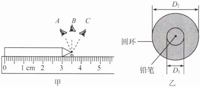 (3)一条纸带厚薄均匀,他把纸带紧密地环绕在圆柱形铅笔上,直至恰好能套进一个圆环内,如图乙所示,纸带环绕了n圈,则纸带厚度是