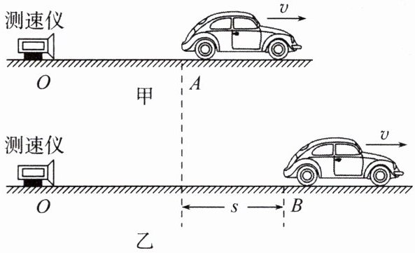 (2)因测速仪与小轿车的距离OB等于超声波通过路程的一半,所以$OB=0.5×102\ m=51\ m$,则小轿车运动的路程$s=OB-OA=51\ m-45\ m=6\ m$。