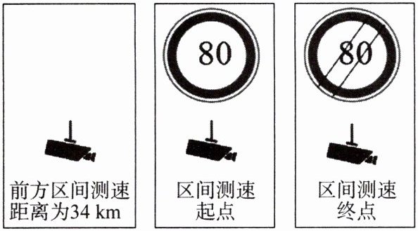 (3)汽车在该区间测速路段行驶的总时间$t=t_{1}+t_{2}=0.2h + 0.2h = 0.4h$,则汽车在区间测速路段的平均速度$\overline {v}=\frac {s}{t}=\frac {34km}{0.4h}=85km/h$,由题图可知,限定速度为80km/h,则平均速度$\overline {v}=85km/h>80km/h$,所以该汽车的平均速度超出限定速度。