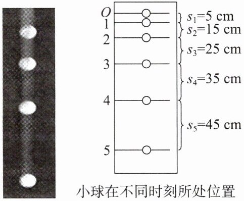 【情境】某兴趣小组在老师的指导下开始研究自由落体运动,他们用频闪照相机(频闪间隔时间 $ t = 0.1\ s $)拍摄下了数张不同质量的金属小球从同一位置自由下落的影像,其中一张如图所示。