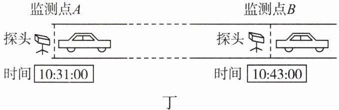 。(2)此处大桥上还设有“区间测速”,就是在两个监测点安装监控探头,测出车辆通过两个监测点的时间,再根据两点间的距离算出该车在这一区间路段的平均速度判断是否超速。若监测点 $ A $、$ B $ 相距 $ 16\ km $,一辆轿车通过两个监测点的时间如图丁所示。
