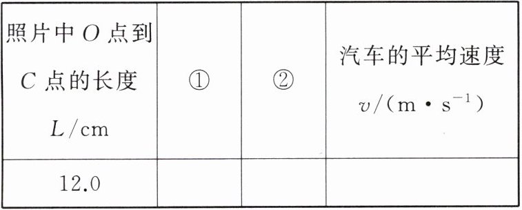 (2)为了通过表格所给的信息计算出汽车从 $ O $ 点行驶到 $ C $ 点的平均速度,请你在设计的表格中将空缺的①②部分补充完整:①______汽车从O点到C点实际运动的距离s/m______;②______汽车从O点到C点实际运动的时间t/s______;汽车从 $ O $ 点到 $ C $ 点的平均速度为______20______ $ m/s $。