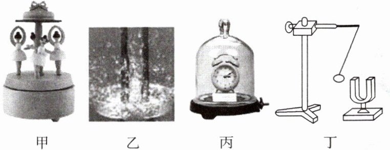 C 解析:将小"人"放在音乐盒(或音箱)上,会发现小"人"随着音乐起舞,说明发声的物体在振动,故A不符合题意;发声的音叉激起水花,说明声音是由物体振动产生的,故B不符合题意;让空气进入抽成真空的罩内可重新听到铃声,说明声音的传播需要介质,故C符合题意;正在发声的音叉将接触的乒乓球弹开,说明声音是由于物体的振动产生的,故D不符合题意。故选C。