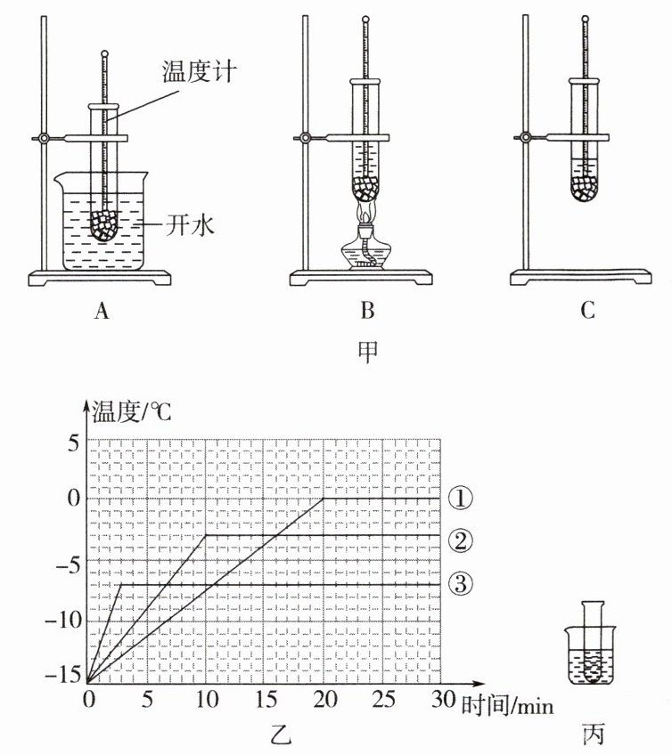 (选填“A”“B”或“C”)。(当时的室温大约是 10℃)(2)图甲中C装置没有用酒精灯对碎冰进行加热,碎冰仍然熔化了,原因是室内温度高于冰的熔点。