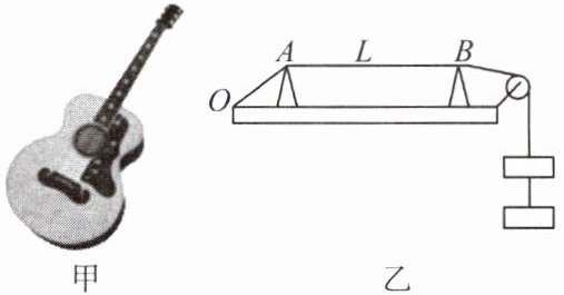 13. 小提琴是由两端固定的琴弦振动而发声的,如图甲所示。为了研究同一根钢制琴弦发出声音的音调与哪些因素有关,可利用图乙所示的实验装置进行实验。已知一块厚木板上有A、B两个楔支撑着琴弦,其中A楔固定,B楔可沿木板移动以改变琴弦振动部分的长度。将钢制琴弦的一端固定在木板上O点,另一端通过定滑轮悬挂不同个数的相同重物,重物个数越多,琴弦绷得越紧。轻轻拨动AB间的琴弦,用仪器测出发声的频率。