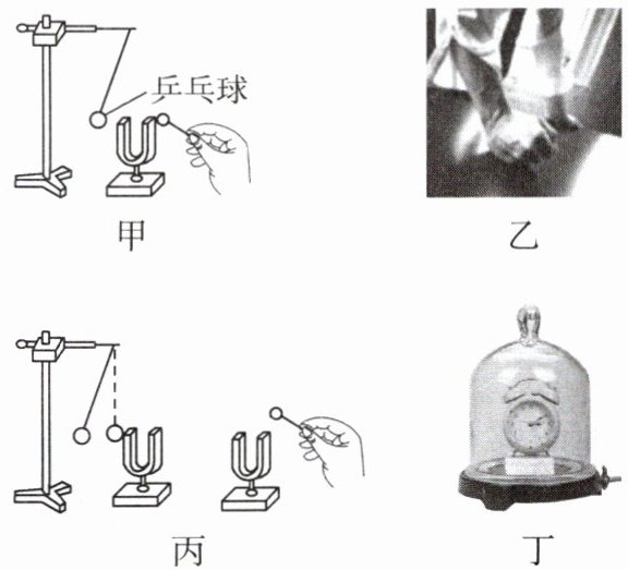 。(3)如图丙所示,敲响右边的音叉,左边完全相同的音叉也会发声,并且把乒乓球弹起。该实验能说明