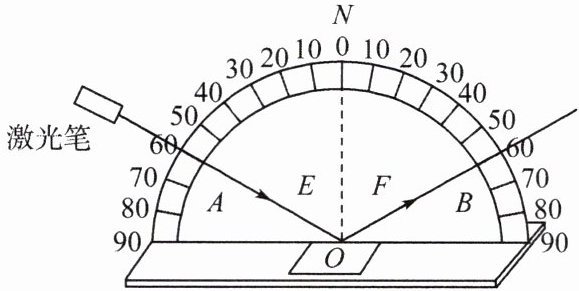 B 解析:射向镜面的光线为入射光线,由题图可知,入射光线从激光笔射向镜面,所以AO是入射光线,故A正确;由题图可知,入射角为60°,由于反射角等于入射角,所以反射角也是60°,故B错误;将激光笔靠近ON,即把入射光线OA靠近ON,则入射角减小,根据反射角等于入射角可知,反射角也会减小,所以反射光线OB也会靠近ON,故C正确;绕ON前后转动F板,E、F两板不在同一平面内,所以F板上观察不到反射光线,故D正确。