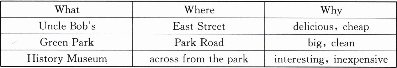 一个外地游客向你打听哪里有最好的餐馆、最漂亮的公园和最有趣的博物馆。请根据表格中提示的信息,以短文的形式向他逐一介绍。可适当发挥以使行文连贯。