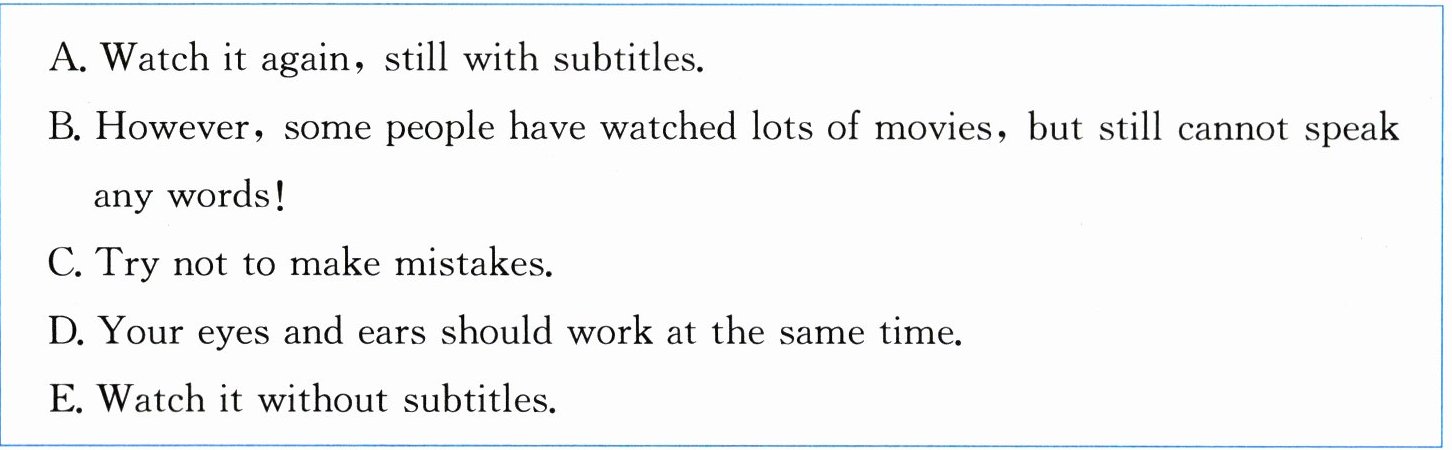 But try your best to see the subtitles less often, and listen as much as you can. Look at the subtitles quickly only when you really don’t understand.Step 3: Don’t reach the last step too early because it can probably make you feel frustrated (沮丧). It sounds difficult. But believe me, after enough practice during the first two steps, you will find it easier.